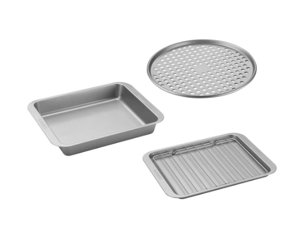 Great little set that compliments my Cuisinart air fryer/toaster oven. The pizza pan is particularly helpful. Don’t have to heat up the large oven to heat up leftover pizza. The flat tray is great to bake six Pillsbury style cookies and I’ve roasted a pork tenderloin in the roaster pan. What I love is how quickly all this can be done without too much effort. Again, not heating up the kitchen on a 90+degree day using the large oven is wonderful.