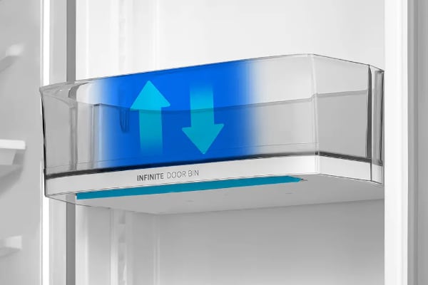 Moves up or down with just one touch, allowing you to easily load new items without having to empty the other bins first.