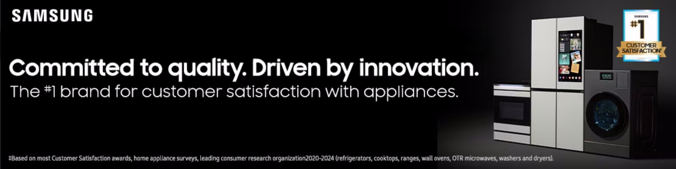 Samsung makes appliances of all kinds that are all meant to make your time in the kitchen easier. Samsung refrigerators are all built to last. They can come in a number of different styles to suit your individual needs, and they can come with many amazing features. Many of the models in our inventory feature smart functionality, so they can connect to WiFi which unlocks a number of features for them. Some of Samsung's best fridges also include the family hub, which comes in the form of a display on the door of your refrigerator and allows you to perform a number of tasks right from your fridge. Samsung refrigerators can also come in many different styles including the popular stainless steel finish, and some of them can even be customized further if they are among Samsung's Bespoke series. Any appliance from this series is able to have their front panels customized to allow you to create many different style variations. Samsung dishwashers can do much more than just wash dishes. Many of the models in our inventory come with smart functionality, and multiple wash cycles. Having multiple wash cycles allows the dishwasher to properly clean your dirty dishes no matter what's on them. Their dishwashers can also come in many different colors, and there are some models from the Bespoke series to choose from as well. Samsung ranges are optimized to make cooking easy. Many of the models in our inventory feature smart functionality along with a number of different functions that make mealtime easier. You can also find ranges in our inventory that operate with gas, electric, dual fuel, or induction. Their ranges can come in a variety of clean colors and finishes as well, and you can find them in a number of different sizes in our inventory. Samsung microwaves are reliable appliances that can handle your leftovers with ease. The models in our inventory come with different power levels, so you can cook specific foods differently, and fingerprint resistant finishes so that they always look clean. Speaking of how they look, the microwaves in our selection can come in multiple colors and finishes so that they can fit in with the style in your kitchen. Samsung cooktops & rangetops can fit neatly into your kitchen to provide a sleek but effective cooking surface. Many of the models in our inventory feature smart functionality. You can also find cooktops in our inventory that run on gas, electric, or induction. They can come in multiple colors and finishes so that they can more effectively blend into your kitchen. Samsung wall ovens are great appliances for anyone that's looking for a seamless kitchen but doesn't want to compromise on power. Many of the models in our inventory feature smart functionality and come with dual convection and self-cleaning options that make them both powerful and convenient. When it comes to style these ovens can come in a few different stylish colors and finishes, like black, or stainless steel. Samsung range hoods & ventilation are stylish appliances that can handle your kitchen ventilation needs. Many of the models in our inventory feature multiple lights, to make sure you can see in the kitchen, and multiple speed options so it can handle even the smokiest of meals. You can find these appliances in black, or stainless steel finishes. We also carry a small selection of Samsung wine coolers and Samsung freezers. The wine coolers can handle the storage of your finest wine bottles, while the freezers are perfect extra units for anyone that needs a little extra freezer space.